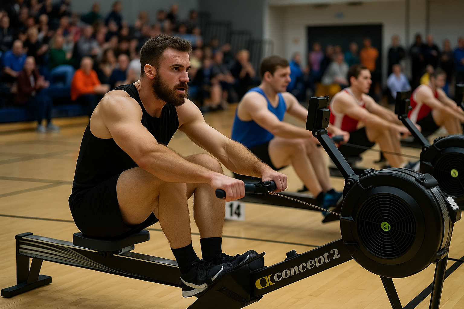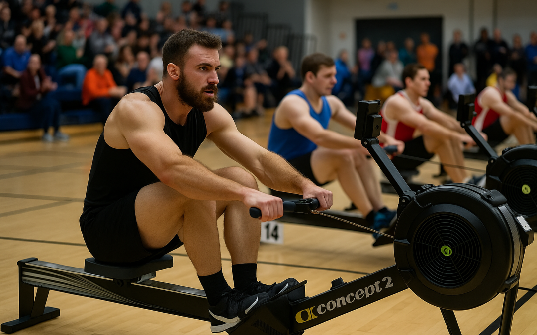 High-intensity action shot of male athletes racing on Concept2 RowErgs during the Australian Indoor Rowing Championships 2025, with spectators watching from the stands.